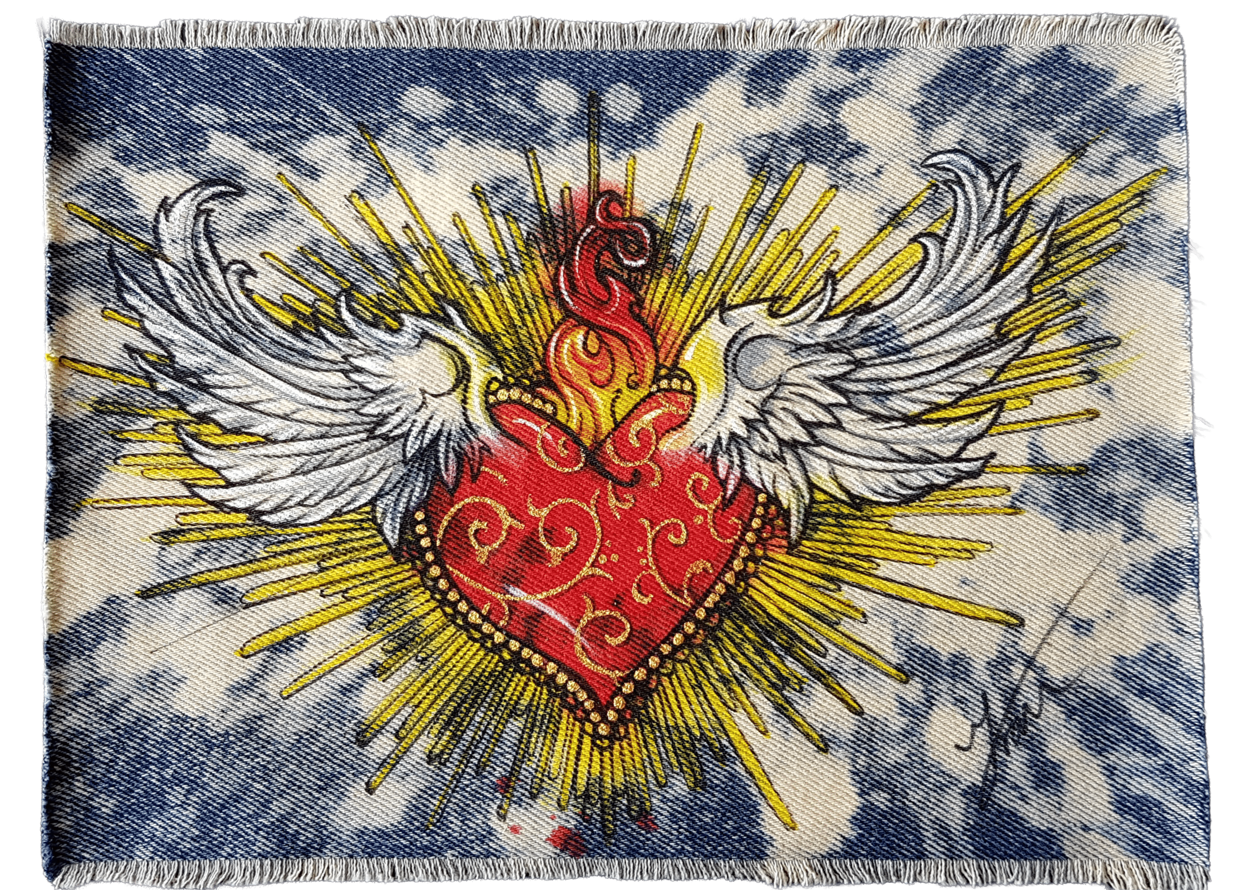 I started painting on friends' jackets years ago. The kind of imagery you'd find tattooed on skin. Sacred hearts, wings, serpents, flames. Gothic iconography. Rock and roll. It's the aesthetic I've always lived in.